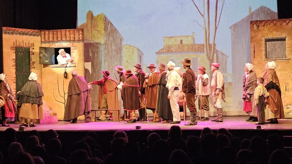 Sur scène, le Roudelet Felibren fait revivre cette tradition avec une fidélité et une énergie remarquable. Les costumes d’époque, la langue provençale, les décors rustiques et les chants donnent l’impression que le temps s’est arrêté. Les personnages sont hauts en couleur : le ravi un peu naïf, les bergers malicieux, les anciens pleins de sagesse… chacun apporte sa part de rire et d’émotion. Le public se reconnaît dans ces figures, parce qu’elles parlent d’un monde proche, enraciné dans la terre et les saisons.